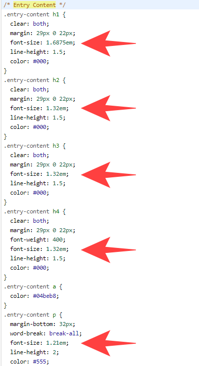 - ctrl + f 누르고 드래그 풀고 엔터 하면 h1 h2 h3 h4 있는데 h1은 제목이기 때문에 변경하지 않고 h2~h4 폰트 사이즈를 같은 사이즈로 조정하면 됨 1.34 적용 h4 아래 보면 p 있는데 이게 본문 글자 크기 가독성이 좋게 기본보다 약간 크게 해 주는 것이 좋다 기본 0.9375 > 1.21 적용 이런 식으로 본인이 원하는 사이즈로 변경 가능하다